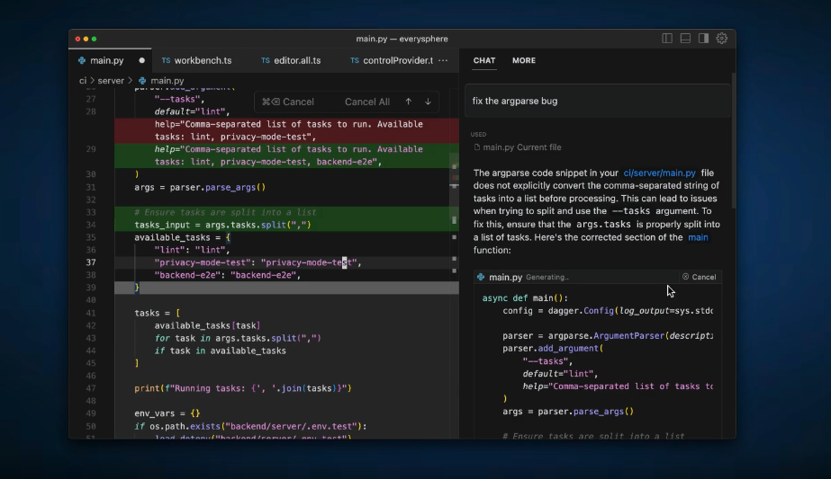Chat with your codebase to trace bugs through complex call chains. Cursor follows imports, understands types, and can pinpoint issues across files.