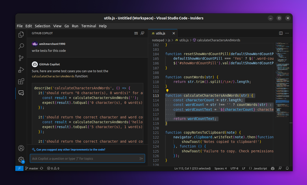 Understand unfamiliar codebases by asking Copilot to explain functions, identify potential bugs, and suggest improvements.